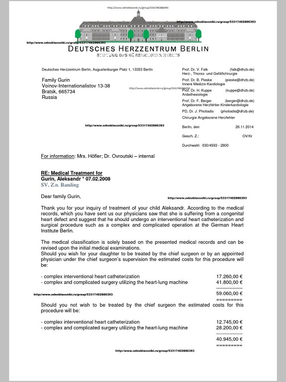 "Единственная надежда осталась у меня на Вашу помощь . Моего ребеночка зовут ГУРИН АЛЕКСАНДР ЕВГЕНЬЕВИЧ 07.02.2008 Г/Р,проживаем мы в городе Братске, Иркутской области, ул. Войнов-интернационалистов д13-кв.38., меня зовут Гурина Светлана Александровна, вот и вся наша семья!! Экология в нашем городе все больше и больше влияет на наше здоровье, не прошло и мимо нас!!!! У моего сыночка страшный диагноз : ВПС, единый желудочек сердца, транспозиция магистральных сосудов, ДМПП вторичный и совсем недавно выявлена еще и недостаточность митрального клапана 3ст.Легочная гипертензия, которая не дает моему сыну нормально жить!!!!!Диагноз нам поставили на четвертом месяце после рождения, но подозрение на порок были уже на второй день его жизни! хотя всю беременность я отходила без каких либо отклонений! Каждый год мы планово посещаем областной центр в городе Иркутске и вот только сейчас врачи выявили желание прооперировать его , но при больших страхах. В моей жизни не было слишком много счастливых моментов, но никогда прежде я не была так счастлива когда у меня появился мой малыш!Узнав о клинике в Германии, чьи врачи делают действительно чудеса, я обратилась за консультацией именно к ним, зная что в России таких деток оперировали не много, и что чаще всего результат заканчивался трагично! На мое письмо они ответили сразу, и как только они получили результаты последних обследований, то естественно согласились, понимая, что наша ситуация не из лучших! Но к сожалению таких средств мне самой никогда не найти, даже если все продать, хотя продавать то мне собственно и нечего!!!Разве что свою жизнь в обмен на жизнь своего ребенка! Я не работаю, так как не один работодатель меня не хочет держать, сыночек потому что очень часто болеет, из целой недели мы ходим в садик максимум три дня! а садик для него это единственное место, где он может пообщаться со своими сверстниками! Поэтому сижу дома по уходу за ребенком - инвалидом!Весь доход составляет 21850 рублей в месяц, при том условии что я снимаю квартиру за 10000рублей,так как своей не имею.
