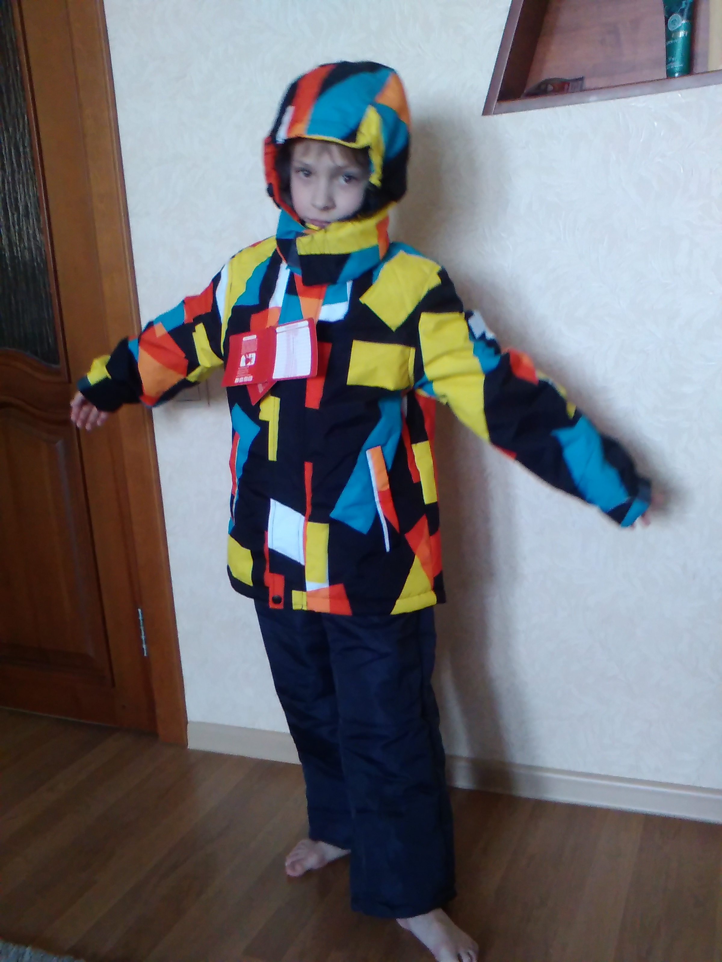 Фирма Meitesi, размер 140. на фото ребёнок - рост 128, стройный. Куртка с приличным запасом, на наш рост не совсем комфортна сейчас, большая. Сезона на два, как минимум. у штанов гораздо меньше плюса.