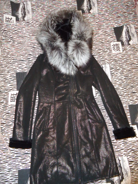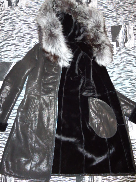 Зимнее кожаное пальто на меху козлика, крашенного под рысь, очень теплое и стильное. Внутри полностью обшито мехом. Длина 95 см.