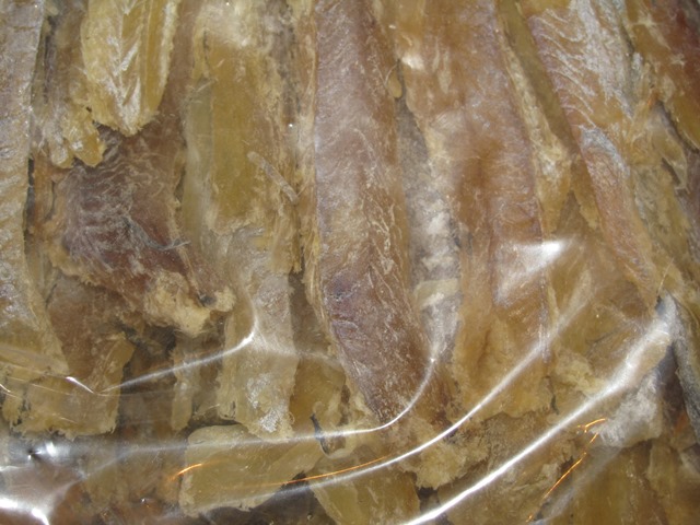 Минтай (янтарная рыбка) солено-сушеный с перцем (кусочки). Состав: рыба минтай, соль, красный перец.