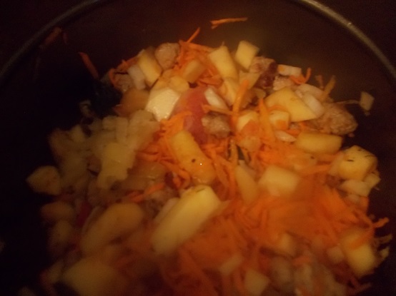 У меня были фрикадельки из фарша\можно заменить колбаской или сосисками а можно и вообще без мясного\