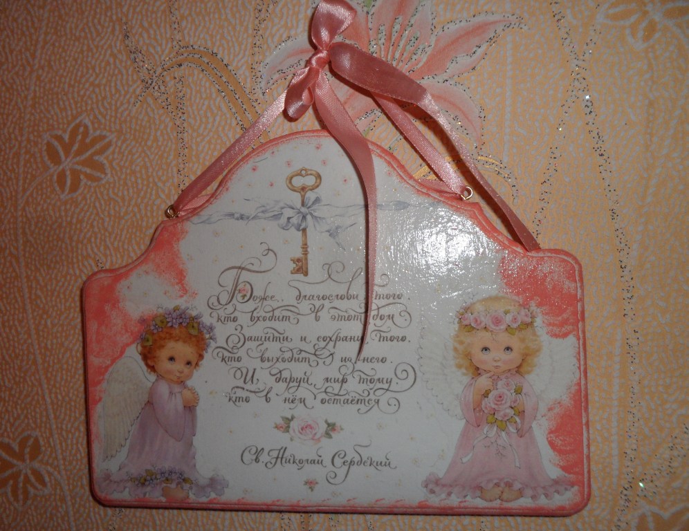 это панно ( не знаю как правильно назвать) в коридор. Для яркости панно заглавные буквы везде обвела черным акрилом, в ключике вставки из синих полубусин. Ленту с бантом тоже подкрасила синим акрилом.
