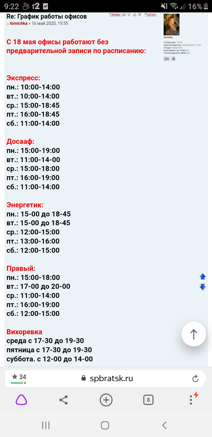 раюза писал(а):Здравствуйте! Выложите расписание офиса ДОСаФ . Только, пожалуйста, не по ссылке.Надо обновить расписание в информационном разделе. В 2011 году было поставлено и не обновлялось. Не получается посмотреть. То расписание, что было на двери офиса почему- то не совпадает .Мы живём на даче и не можем узнать расписание, чтобы подгадать и приехать за заказами.