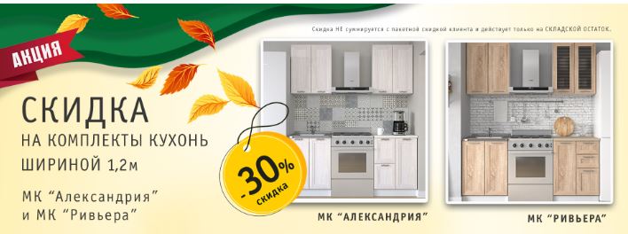 СКИДКА 30% НА МК “РИВЬЕРА” И “АЛЕКСАНДРИЯ” шириной 1,2 м (кухонный гарнитур)