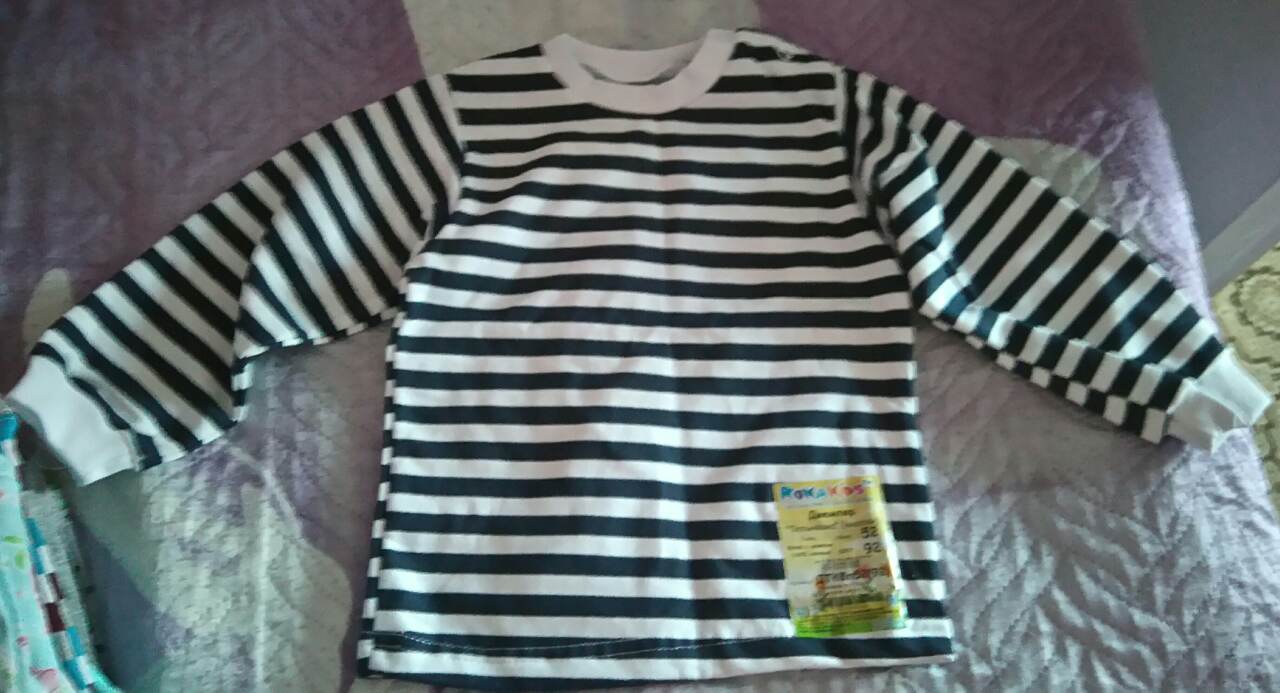 Тельняшка, ткань футер с начесом, тепленькая приятная на ощупь, мягкая, при стирке не села и не полиняла, рост на 92.