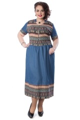 Милое платье полуприлегающего силуэта из текстильного полотна синего цвета и вставками из ткани с купонным узором в этническом стиле коричневого цвета. V-образный вырез изделия обработан внутренней обтачкой и дополнен декоративной стойкой. Изделие с втачными рукавами. Рукава по низу дополнены манжетами. По переду изделия планка с застежкой на молнию. Платье отрезное по линии талии и дополнено складками. Аксессуары в комплект не входят. Длина изделия по спинке от плечевого шва до низа изделия — 127 см.