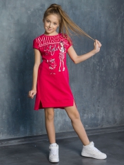 Описание из каталога:Платье для девочек. Новинка: платье умеренного объема с небольшим спущенным цельнокроенным рукавом; силуэт кокон с перепадом длин переда и спинки; боковые швы переведены на перед и образуют разрезы по низу изделия; принт с графичным мерцающим блеском; перевод принта Мисс.Стиль . Состав: 100%хлопок