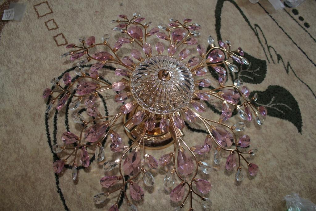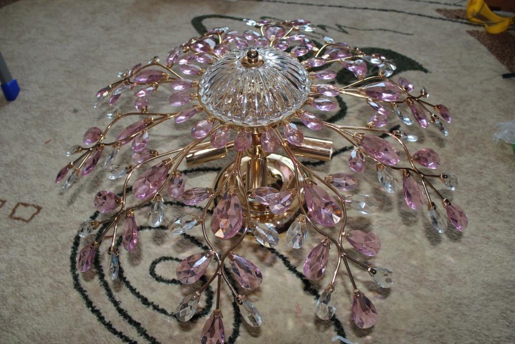 Второй заказала люстру Светильник "Каскад" 157046 розовое золото шатон белый розовый 3480 р. +522+452,4=4464,4 руб. Люстра тоже пришла хорошо упакована и полностью разобрана. Муж целый день собирал и крепил кристалики, но в итоге получилось красота. Розовые кристаллы достаточно насыщенного цвета, я думала бледнее будет, но на потолке и так хорошо. Планировала в спальню, но пока повесили в зал, для зала маловато света, на мой взгляд. Так что когда куплю в зал люстру, эта все таки пойдет в спальню, там комната меньше.