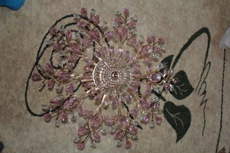 Второй заказала люстру Светильник "Каскад" 157046 розовое золото шатон белый розовый 3480 р. +522+452,4=4464,4 руб. Люстра тоже пришла хорошо упакована и полностью разобрана. Муж целый день собирал и крепил кристалики, но в итоге получилось красота. Розовые кристаллы достаточно насыщенного цвета, я думала бледнее будет, но на потолке и так хорошо. Планировала в спальню, но пока повесили в зал, для зала маловато света, на мой взгляд. Так что когда куплю в зал люстру, эта все таки пойдет в спальню, там комната меньше.