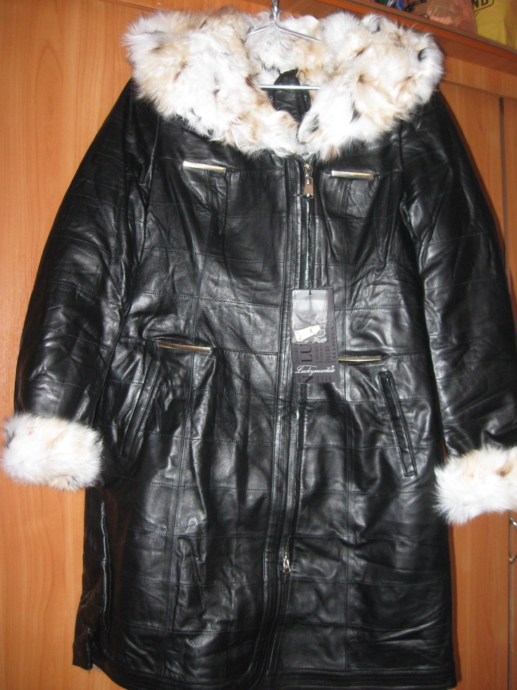 Очень понравилась модель Арт. Н.27 Кожаный пуховик с воротом из кролика. Утеплитель - пух. Ремень в комплекте. Длина 80 см.