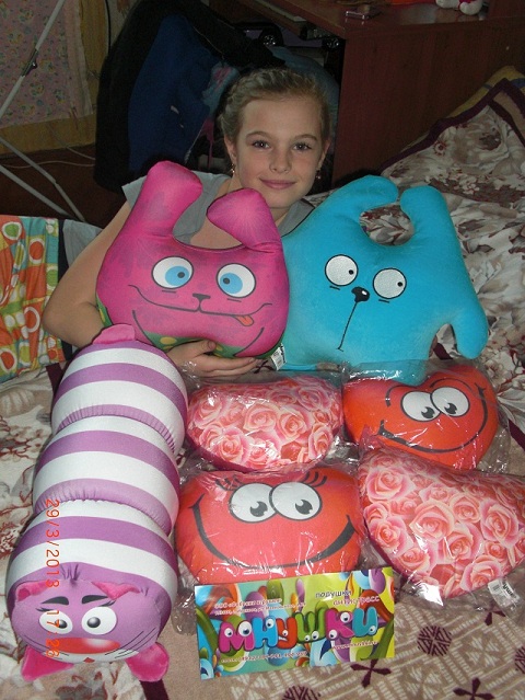 Мне тоже очень мнушки понравились. Заказывала гусеницу фиолетовую. С кошачьей мордой :laugh1: Я такого размера конечно не ожидала, она большая и мягкая, все любят на ней лежать :)