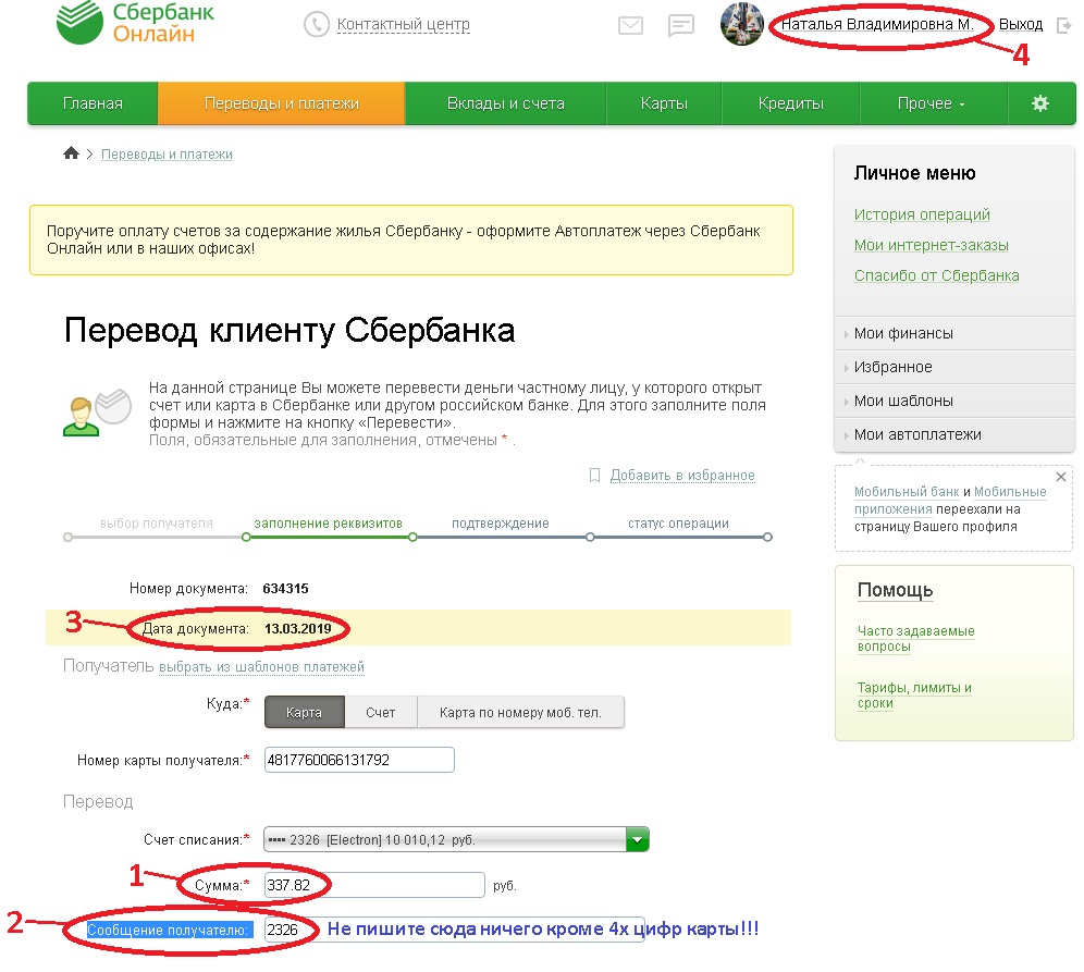 2. ВПИШИТЕ 4 ПОСЛЕДНИЕ ЦИФРЫ ВАШЕЙ КАРТЫ(весь номер не нужен) В ПОЛЕ "Карта", А ТАКЖЕ НЕ ЗАБУДЬТЕ ВПИСАТЬ ЭТИ 4 ЦИФРЫ В Сбербанке Онлайн во время оплаты в поле "sms сообщении получателю"(см. фото ниже) - НЕ ПИШИТЕ В СООБЩЕНИИ НИЧЕГО, КРОМЕ 4Х ЦИФР ВАШЕЙ КАРТЫ(ни сумму, ни ваше ФИО, ни ваш НИК - НИЧЕГО, кроме 4х цифр карты)!!!