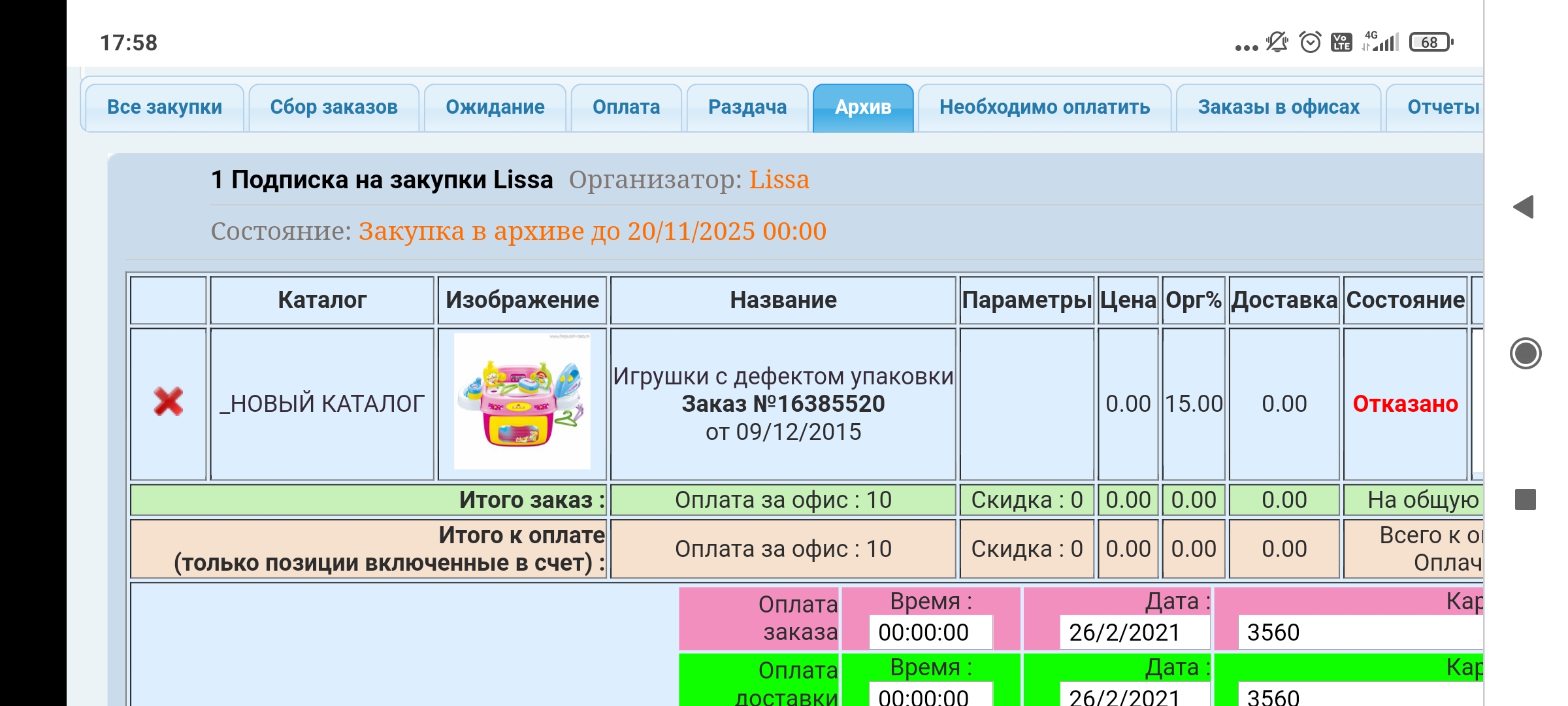 Нужно найти эту закупку и удалить в ней заказ. Нажмите вкладку все закупки, если там не нашли то вкладку Архив.