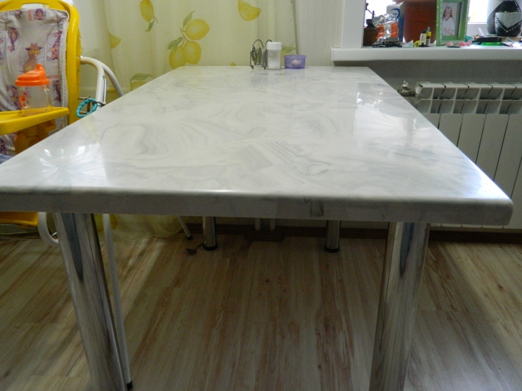 ИриС писал(а):Теперь у меня вот такой стол, столешница из литьевого мрамора, а ножки купили и приделали. Теперь нужно стульчики приобретать, а то старые деревянные табуретки никак не вписываются к такому столу![]()