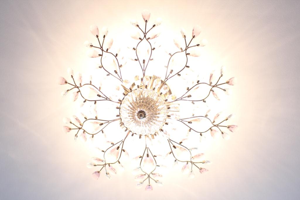 Второй заказала люстру Светильник "Каскад" 157046 розовое золото шатон белый розовый 3480 р. +522+452,4=4464,4 руб. Люстра тоже пришла хорошо упакована и полностью разобрана. Муж целый день собирал и крепил кристалики, но в итоге получилось красота. Розовые кристаллы достаточно насыщенного цвета, я думала бледнее будет, но на потолке и так хорошо. Планировала в спальню, но пока повесили в зал, для зала маловато света, на мой взгляд. Так что когда куплю в зал люстру, эта все таки пойдет в спальню, там комната меньше.